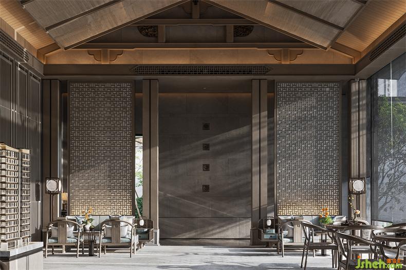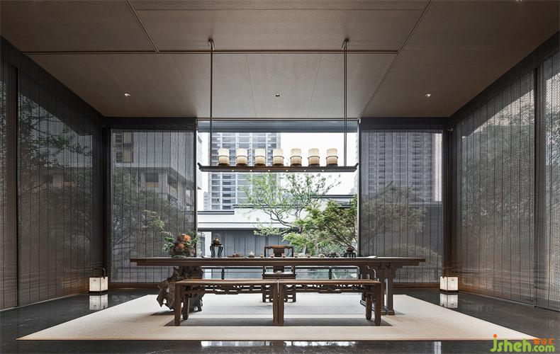一縷茶煙透碧紗,享慧心之外的茶韻墨香。禪茶區(qū)還原宋茶席規(guī)制,會所設計在流淌的水鏡中呈合圍環(huán)抱之勢,將東方意境恰到好處地彰顯。天花采用萬字紋的圖形以現(xiàn)代手法構造,四面以金屬格柵圍合,以一種虛的“隔”的方式,傳達出傳統(tǒng)東方寫意,也讓當代氣質呼應而出。在此茗一杯茶,捧一本書,晨沐朝霞,夜觀星斗,咫尺乾坤盡在眼前。