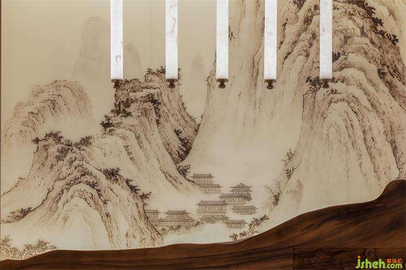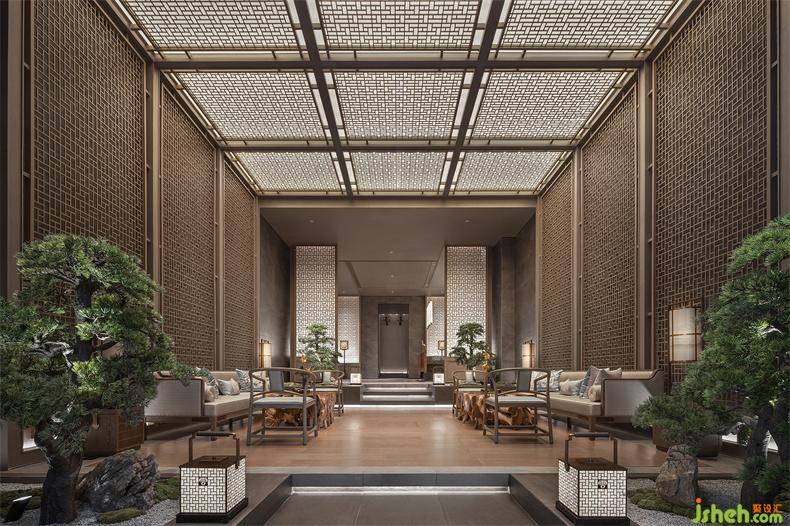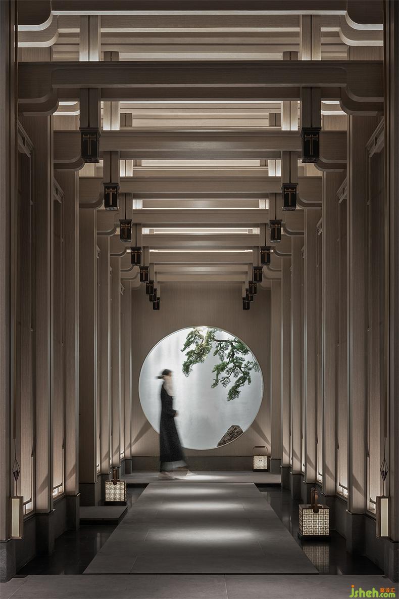 長(zhǎng)廊中的天花由中國(guó)傳統(tǒng)院落得到靈感和啟發(fā),會(huì)所設(shè)計(jì)隱含了北京的四合院和徽派建筑的結(jié)構(gòu)布局。兩側(cè)引水景穿插,中式方形燈籠飾于長(zhǎng)廊之內(nèi),一道云紋的石橋序列其中。整體以含蓄的現(xiàn)代方式詮釋東方意境,陳設(shè)置景,簡(jiǎn)凝詩(shī)意。