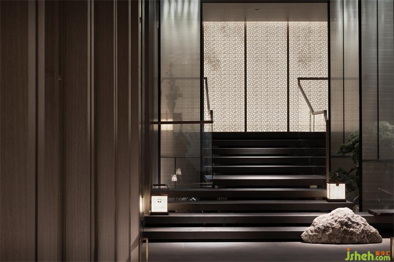 步入地下會(huì)所前廳,以臺(tái)階形態(tài)為媒介,結(jié)合空間框架及功能進(jìn)行設(shè)計(jì),會(huì)所設(shè)計(jì)用簡(jiǎn)潔的體塊貫穿延伸于整個(gè)空間。樓梯兩側(cè)是由水紋燈與夾絲玻璃構(gòu)成的山間清泉流水畫(huà)境,用非水之水,作微波水漾,在光線下更顯動(dòng)人靈光。萬(wàn)字紋下的格柵屏風(fēng)滲透出影綽的竹林清風(fēng),透光幽靜,增添不同層次的感官體驗(yàn)。