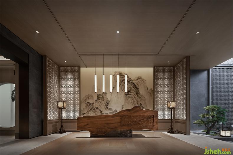 接待大堂整體溫潤(rùn)開(kāi)闊,接待臺(tái)以質(zhì)樸厚重的木頭作為材料面,在屏風(fēng)的映射下,散發(fā)出大氣穩(wěn)重的觀感。