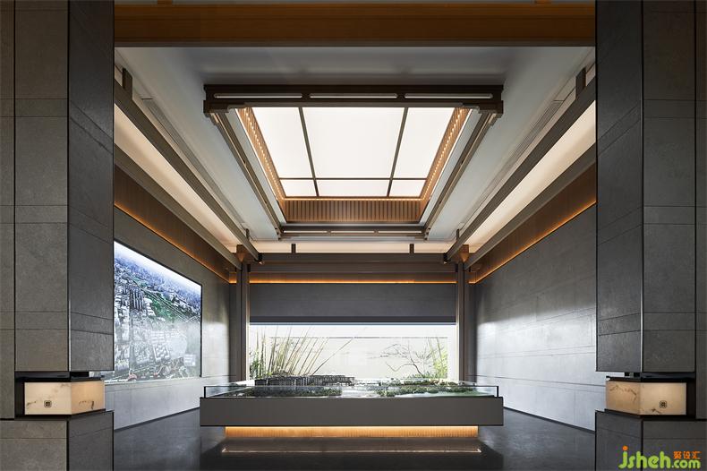 沙盤展示空間采用 “四水歸堂”設(shè)計(jì),室內(nèi)設(shè)計(jì)師其風(fēng)格靈感來源于浙江文化傳承天人合一的理學(xué)思想。