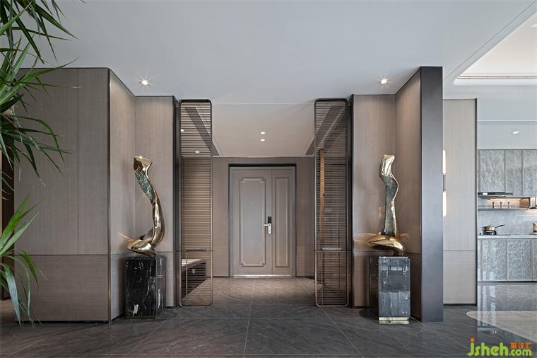 初入玄關格柵按比例分割拓展了縱深方向的空間敘事穿插肌理感圖案