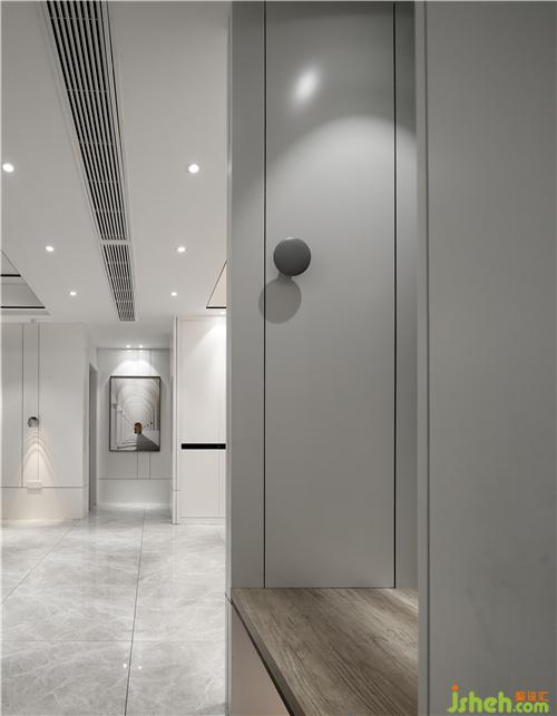 中央空調(diào)設(shè)計在入戶玄關(guān)上面,讓業(yè)主一回到家就可以感受到家的溫度。玄關(guān)處設(shè)計了鞋柜和隔板,隔板既可以當穿鞋凳,平時回到家,手上提的東西或者包包也可以放在上面。室內(nèi)設(shè)計師