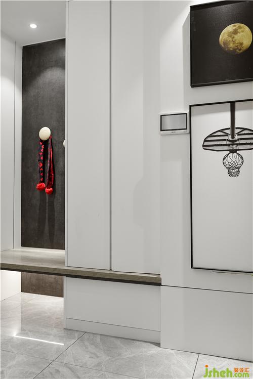 鞋柜旁邊里儲物空間里設(shè)計了圓形掛鉤,一回家就可以把外面穿的衣物掛在上面,不把外面的細菌帶進房間。平時不怎么穿的鞋子放進鞋柜,經(jīng)常穿的鞋子放在隔板下面,穿脫方便,分類擺放,整潔清爽。室內(nèi)設(shè)計師