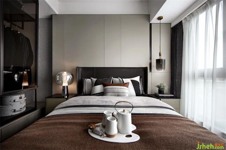 臥室以經(jīng)典灰為主色調(diào),用小塊面拼接成大塊面的Armani灰板,擴(kuò)充床頭視覺感,一種嫻靜平和的舒適感受油然而生,黑色皮質(zhì)床頭板,與淺灰床單、深黃色的床席層層調(diào)劑,襯托選品的細(xì)節(jié),也透露對生活細(xì)致追求的態(tài)度,深圳崗宏融湖居精裝提升樣板房設(shè)計(jì)在最親密的時(shí)刻,愛是能被她感知的,這一場約會(huì)是幸福滿溢的。