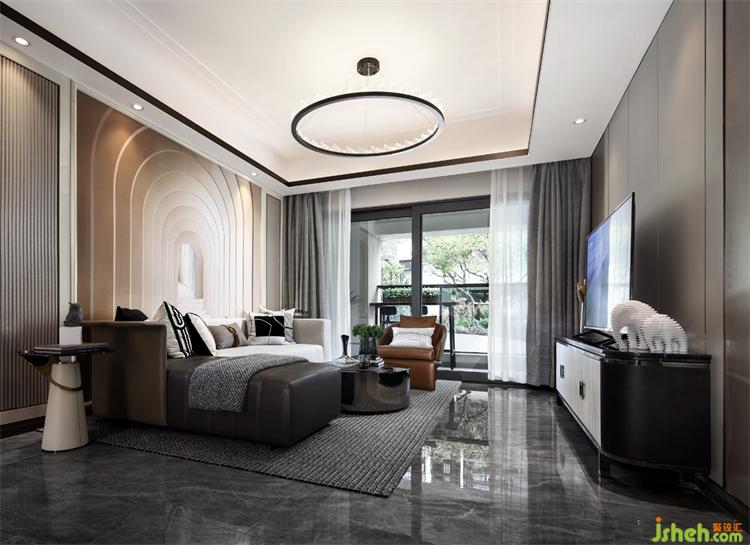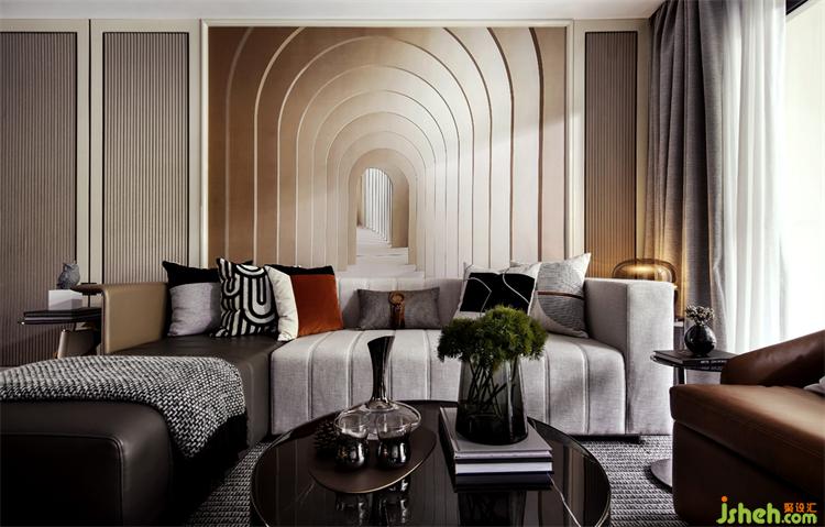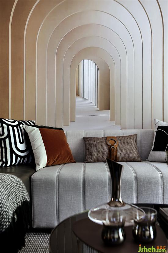 Model House C | 沙發(fā)背景墻延伸感極強(qiáng)的建筑圖案墻紙,包攬了近乎整個客廳墻面,直接帶出了空間的主旋律??此浦皇呛喴椎膱D案,卻能一眼帶來人們好奇心。廣州亞運城精裝樣板房設(shè)計不斷延伸的門后可有盡頭,而深處潛藏何物,無人得知。如同我們的夢想之路,一切都是那么的不可預(yù)知,而帶著無畏與探索的激情,一切都將日漸明朗。