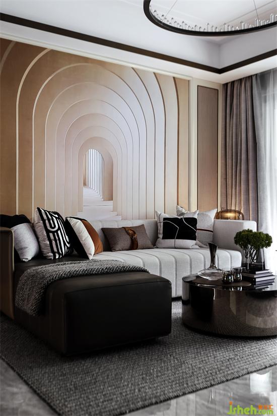Model House C | 沙發(fā)背景墻細(xì)節(jié)重重疊加的拱形組合,以漸變橘配色,由淺到深,層層遞進(jìn),起到了延伸視覺的效果,弧線與直線交匯,流動與利落,硬朗與柔和,相互碰撞,繼而交融。色彩與線條的結(jié)合,賦予空間多重的趣味和獨特的格調(diào)。