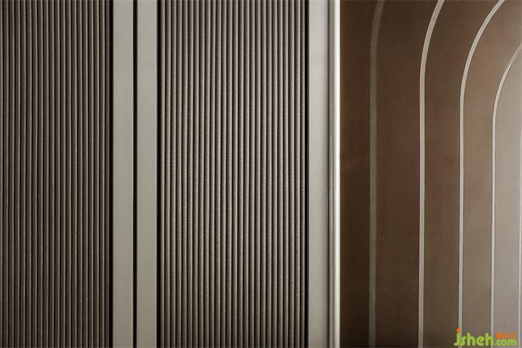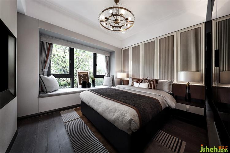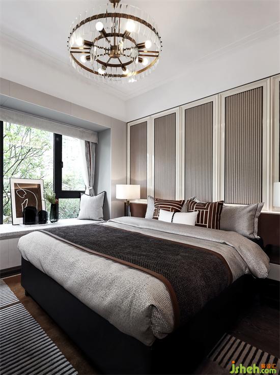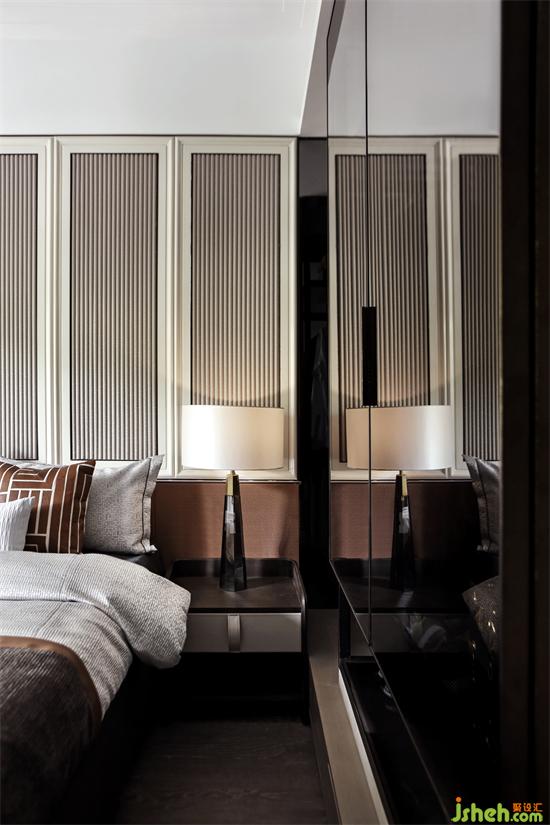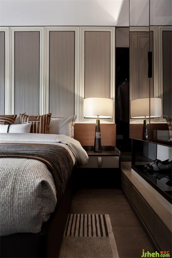主臥背景墻延續(xù)客廳區(qū)域墻身的設(shè)計,不同色彩與幾何元素的靈活運用,廣州亞運城精裝樣板房設(shè)計創(chuàng)造出恰到好處的空間層次,溫暖細(xì)膩的深色木地板,清透明亮的煙灰色玻璃衣柜,搭配質(zhì)感舒適的床品,于無形之中彰顯出主人尊貴的氣度。
