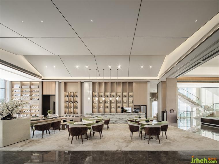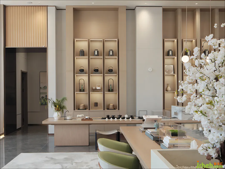 在水吧區(qū),MDG增設(shè)品茶區(qū),使水吧臺(tái)接待功能更具多樣性。在這里,客戶不僅可以體驗(yàn)傳統(tǒng)茶藝文化,品嘗茶飲,還能享受到與銷(xiāo)售人員的親切互動(dòng),提升空間文化調(diào)性。