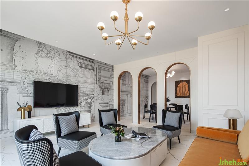 拱廊亦可分隔空間,既能分享自然光,也使其相互獨(dú)立。大面積的黑白草稿墻紙,讓人不禁聯(lián)想到文藝復(fù)興時(shí)期大師達(dá)·芬奇的珍貴手稿,象征著藝術(shù)和科學(xué)的融合。
