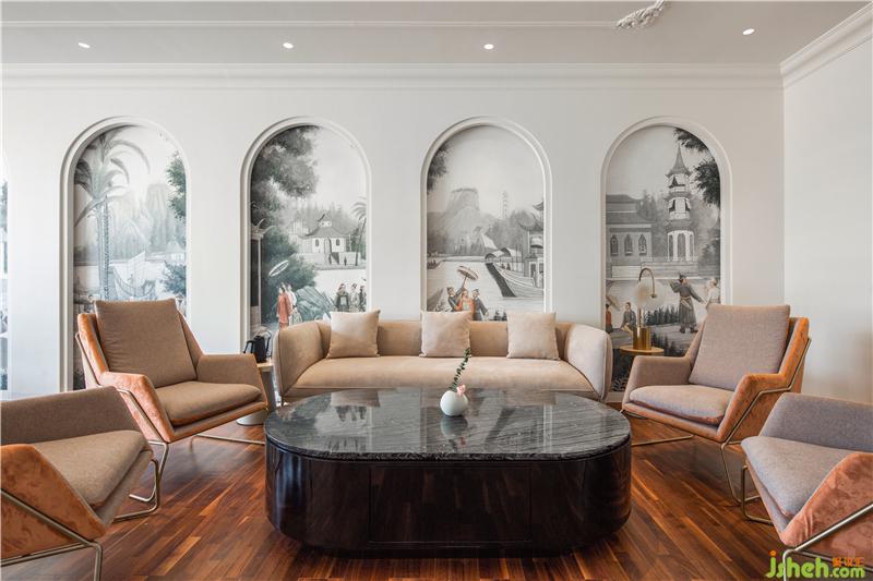 洽談區(qū)內(nèi)利用拱廊營(yíng)造出高挑的建筑感,讓光線以柔和的方式進(jìn)入室內(nèi),墻面上泛灰,紋理淺暗的墻紙模擬出古建筑墻身壁畫(huà)的斑駁質(zhì)感。