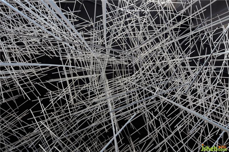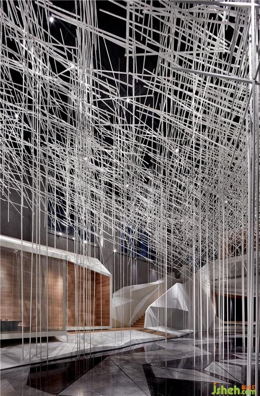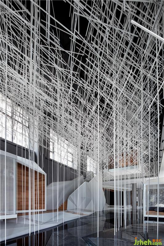 “山陵丘壑”被抽象化為幾何形式;“蘭亭”亦以現(xiàn)代的盒子造型呈現(xiàn),體現(xiàn)高尚不仕、寄情丘壑的理想棲居及最具象征意義的精神依歸;白色線性裝置構(gòu)架在空間中呈現(xiàn)“茂林修竹”、曲逕疏籬、幽篁疏影的詩化意境;“曲水流觴”則幻化為曲徑通幽處,潭影空人心的悠遠(yuǎn)畫面。裝修設(shè)計(jì)