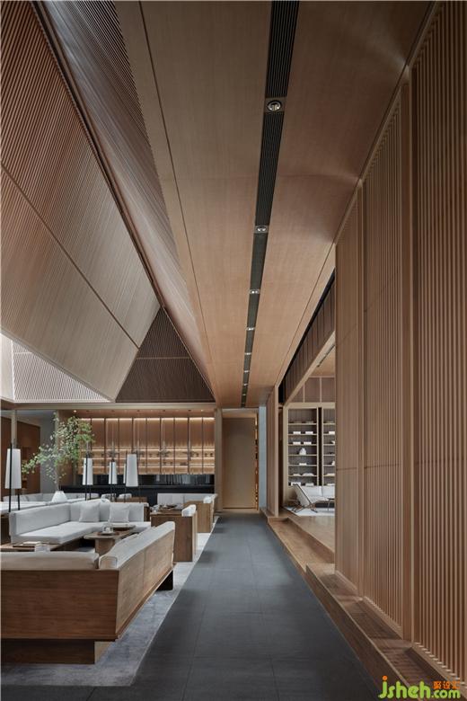 另外,針對(duì)主體沙盤(pán)區(qū)和深度洽談區(qū)等主要的空間場(chǎng)域,上挑的頂部能量再次被聚合起來(lái),以同樣聚合的造型再次向下方的功能承接區(qū)域傳遞能量,同時(shí)起到過(guò)濾上部光線及凝聚并傳導(dǎo)能量和氣息的功能。