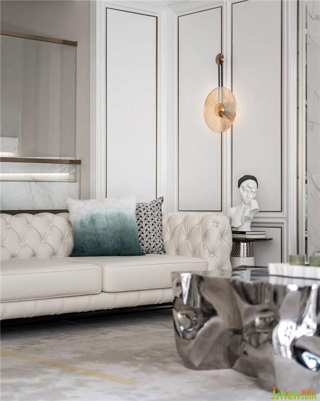 設(shè)計的開篇,豐富的陳設(shè)與裝飾維系著空間優(yōu)雅的節(jié)奏。在白色大理石墻面的映襯下,柔軟的米色皮質(zhì)沙發(fā)、祖母綠色的絲絨座椅、形制不規(guī)則的當代感銀色茶幾、精致華麗而又頗具趣味的藝術(shù)擺件,構(gòu)成了一幅摩登的美學(xué)畫面,其間的每一處褶皺、每一抹色彩、每一條紋路,樣板房設(shè)計均是對優(yōu)雅精神的無聲詮釋。