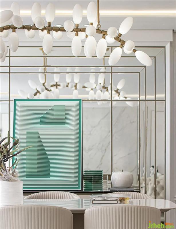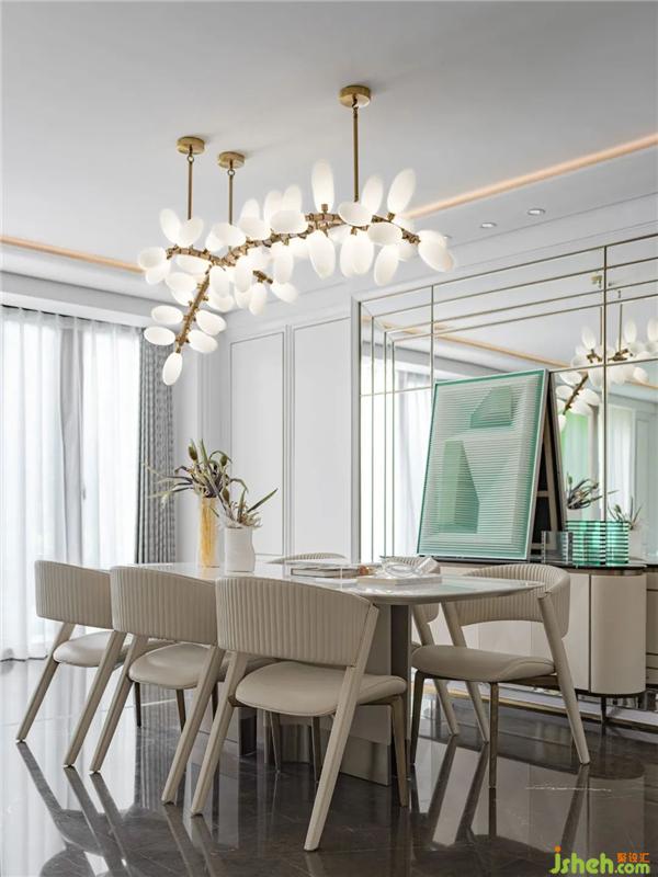 設(shè)計汲取Art Deco的經(jīng)典設(shè)計元素,幾何條紋版畫、黃銅花枝造型吊燈,加之花藝擺件的點綴,令餐廳空間在獨具質(zhì)感的美學(xué)視像中,洋溢著自然的清新與生命力。同時,鏡面反射將空間圖景無限延伸,擴大了居者的視覺觀感與心境體驗。