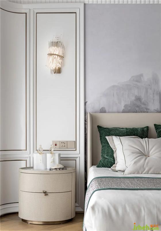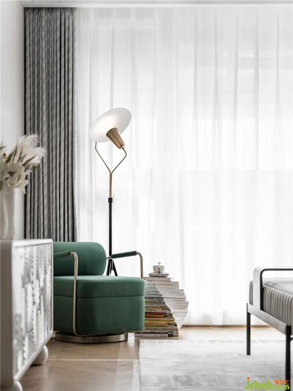 順著大理石臺階步入二層主臥,全明落地窗納入了通透的自然光線。米白、祖母綠、淺棕的色彩組合,及玻璃、金屬、布藝的材質(zhì)碰撞,使得空間更顯迷人的法式優(yōu)雅。單人墨綠扶手座椅搭配精致造型的落地燈,構(gòu)成了一處休閑靜處的角落。在這里,居者可以隨意擇一本書,享受優(yōu)雅的午后時光。