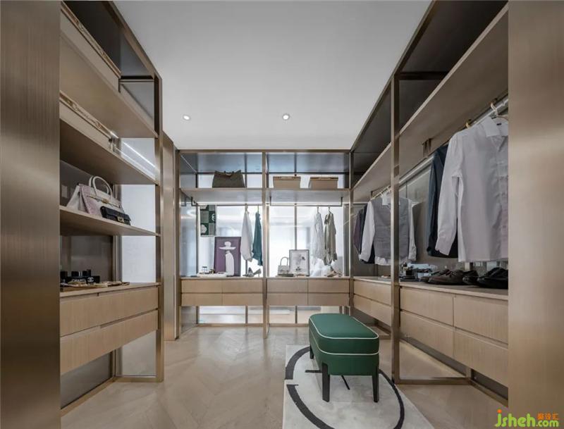 在開放式衣帽間,大面積柜體設(shè)置提升了空間的收納功能。在材質(zhì)上,設(shè)計(jì)選用木質(zhì)與金屬的融合,于細(xì)節(jié)處突顯精尚的工藝,以此呼應(yīng)當(dāng)代都市生活的儀式感。