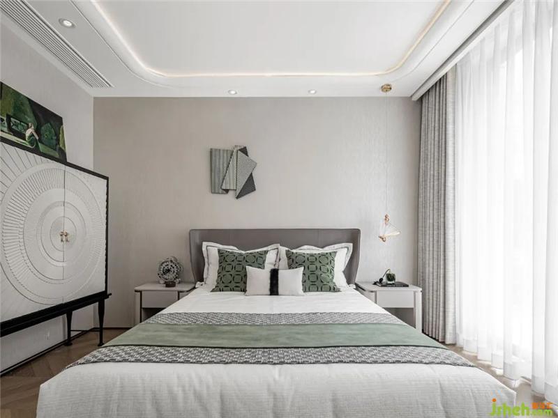 在深棕、淺灰、米白的淡雅色調(diào)中,設(shè)計(jì)選取不同層次的綠色點(diǎn)染于其間,堆疊出空間別樣的色彩層次。墻面的不規(guī)則線性裝置、邊柜的復(fù)古花紋、抱枕的幾何圖案,作為跳脫的藝術(shù)表達(dá),于簡(jiǎn)約中蘊(yùn)藏著雅致的美學(xué)內(nèi)涵。
