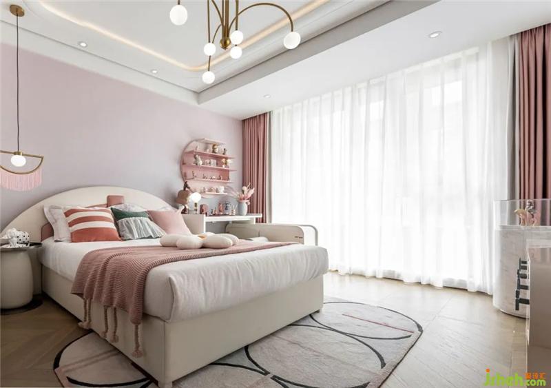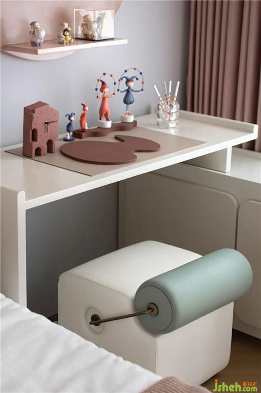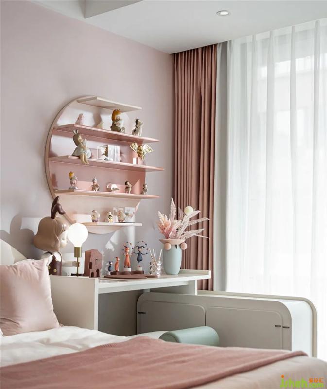 從孩童的視角出發(fā),女兒房如同一個(gè)夢(mèng)幻的童話樂園,沉浸在一片溫柔的粉色中。趣意十足的卡通人物擺件、花朵造型玩偶,在弧線的勾勒中,傳達(dá)出純真美好的童趣,承載著女孩天真浪漫的夢(mèng)想。