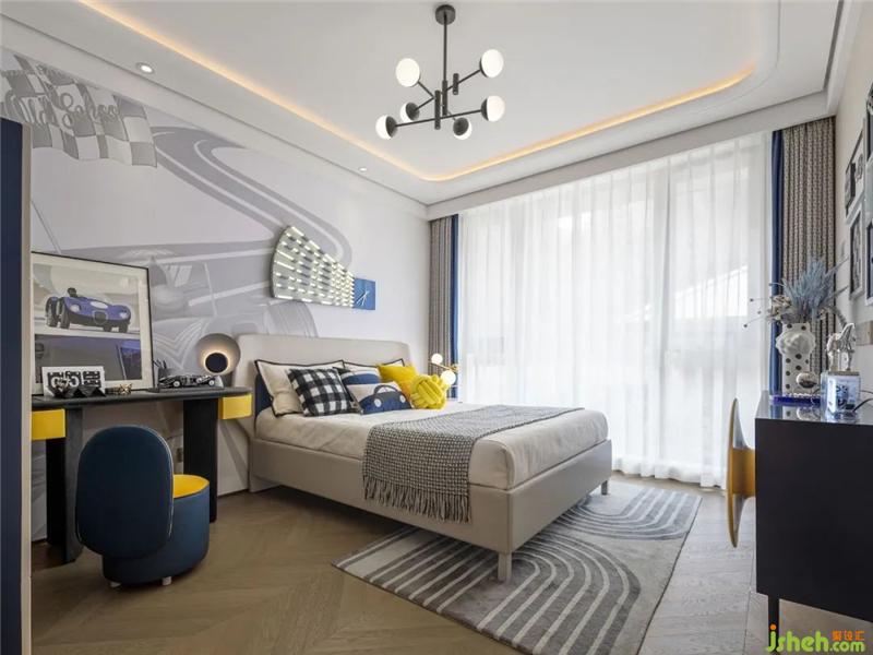 在此,設(shè)計(jì)師再次發(fā)揮色彩的妙筆,以深藍(lán)與明黃的點(diǎn)綴作為空間的主色調(diào),令空間更顯活潑生動(dòng)。同時(shí),在場(chǎng)景氛圍的營(yíng)造中,跑車及曲面元素的運(yùn)用,賦予了空間嶄新的創(chuàng)意及玩味,亦彰顯出男孩潮酷的自由個(gè)性。
