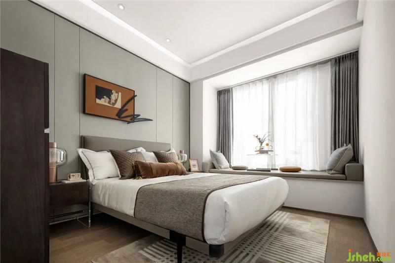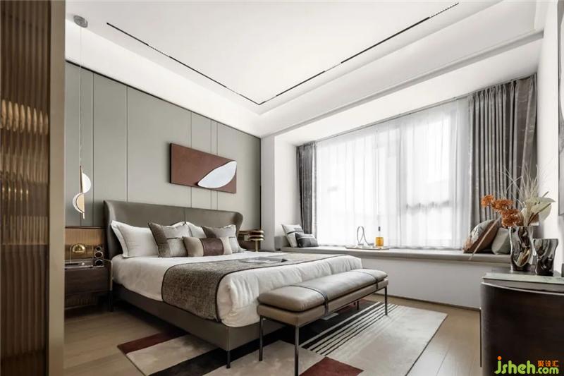 柔軟的床頭軟包、具有光澤感的絲絨、精致的木制角柜串聯(lián)起空間的雅奢氣質,亦以豐富的空間觸感,帶給居者踏實而溫暖的體驗感。