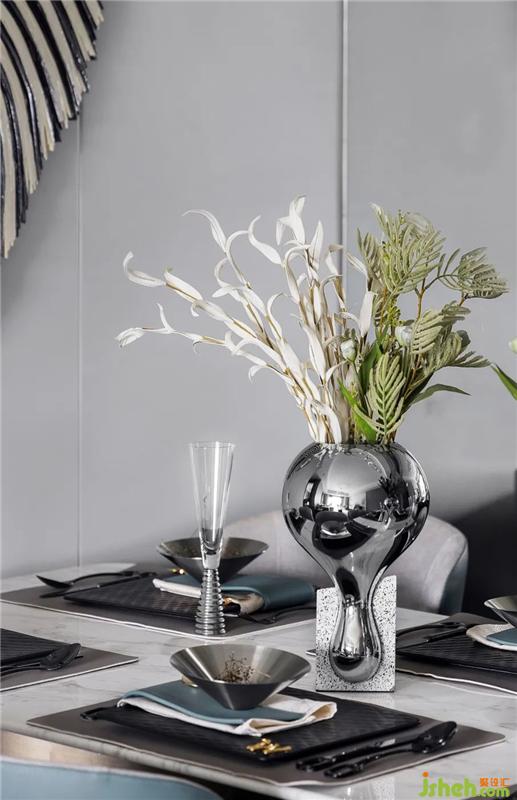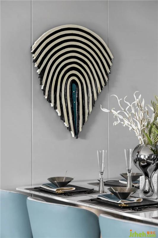 在餐廳的配色中,設(shè)計(jì)選用深青與雅灰,鋪敘空間底色的當(dāng)代質(zhì)感。同時(shí)在細(xì)節(jié)的點(diǎn)綴處,黑白條紋的藝術(shù)裝飾、環(huán)繞式金屬圓環(huán)吊燈,以時(shí)尚精致的藝術(shù)表達(dá),再次強(qiáng)化Art Deco的裝飾性,恰到好處地表意著空間的精神內(nèi)蘊(yùn)與美學(xué)風(fēng)度。