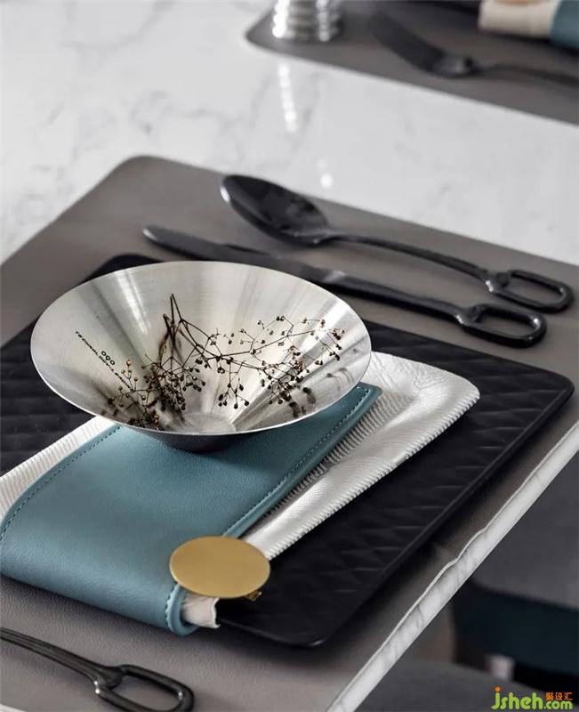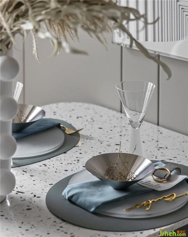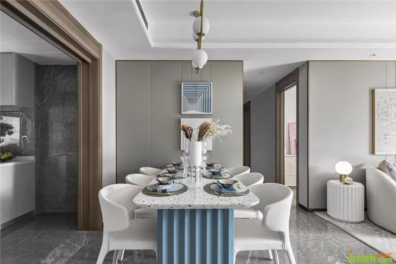 設(shè)計(jì)在餐廳中引入現(xiàn)代簡約的美學(xué)精神,在延續(xù)白調(diào)的基礎(chǔ)上,以低飽和度的藍(lán)色系加以點(diǎn)綴,定義空間的當(dāng)代主義風(fēng)尚。細(xì)膩精致的金屬、通透靈動(dòng)的玻璃、有趣的幾何造型,每一處設(shè)計(jì)都透露著空間精致的藝術(shù)美感,每一筆勾勒都描摹著優(yōu)雅的場域氣質(zhì)。