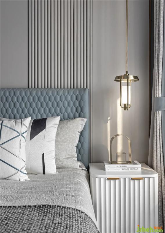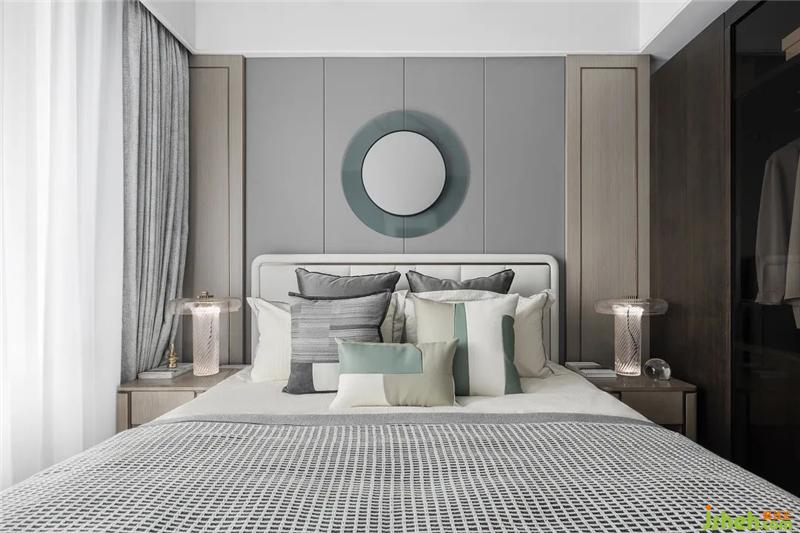 步入主臥,淺淡的米白、青綠、灰色,交織出溫和平靜的空間情緒。在考量空間比例的基礎(chǔ)上,設(shè)計(jì)師透過巧妙的對(duì)稱布局與空間構(gòu)設(shè),以圓與線條紋理的組合、玻璃與木質(zhì)的搭配,令整體空間呈現(xiàn)出一幅協(xié)調(diào)的構(gòu)圖畫面,又不失細(xì)節(jié)的質(zhì)感。