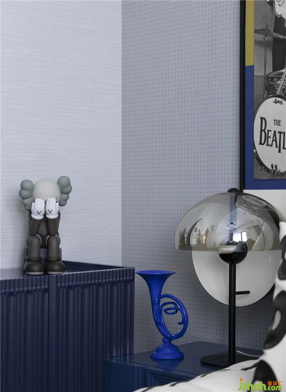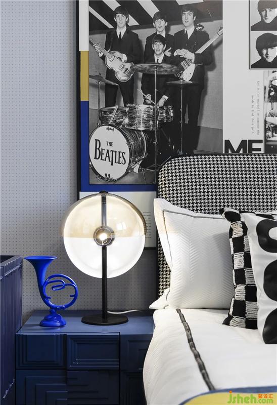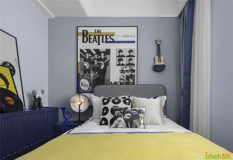 孩童對(duì)于藝術(shù)有著天然的敏感度,在普魯士藍(lán)黃二色對(duì)撞帶來的視覺沖擊下,樣板房設(shè)計(jì)通過The Beatles樂隊(duì)的元素演繹,以及黑膠、尤克里里、小號(hào)的陳設(shè),為男孩創(chuàng)造了一個(gè)精彩絕倫的音樂世界,極大激發(fā)起孩子的無限想象力。