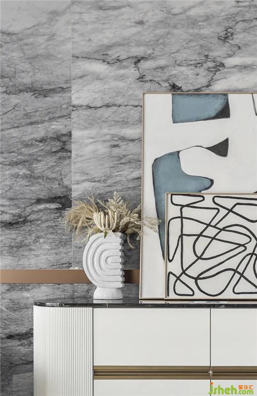 設(shè)計(jì)師在此思考如何通過細(xì)節(jié)的刻畫,建立居者與空間的情感鏈接。在白調(diào)的基底上,毛絨的柔軟沙發(fā)、抱枕的抽象條紋畫、光滑明亮的理石等多種層次的美學(xué)疊加,在視覺與觸感層面,調(diào)動(dòng)起居者對(duì)于生活的豐富感知,實(shí)現(xiàn)嶄新而自在的人居體驗(yàn)。