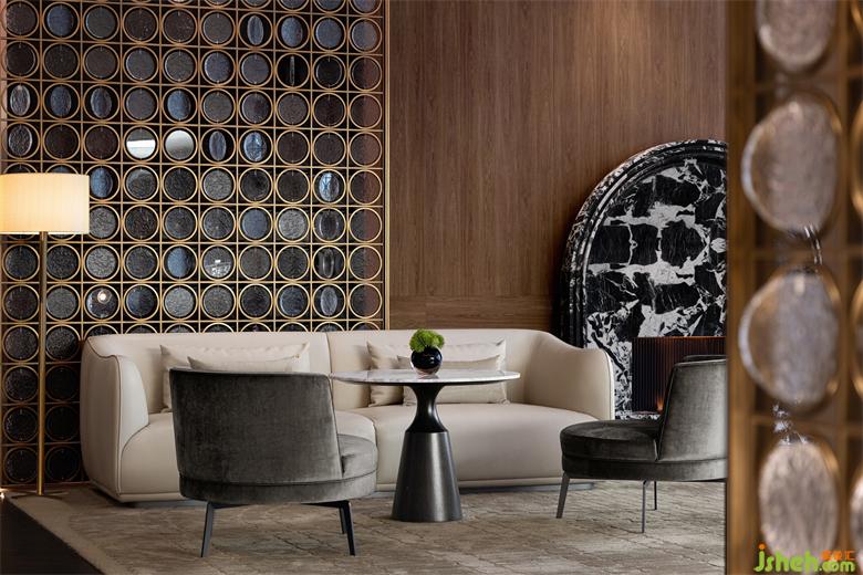 深色大理石的拱門型壁爐,售樓處設計復古雅致的木色墻面,敦實落地的座椅,被屏風柔化的自然光線,營造出一處奢華私密的深度洽談空間。