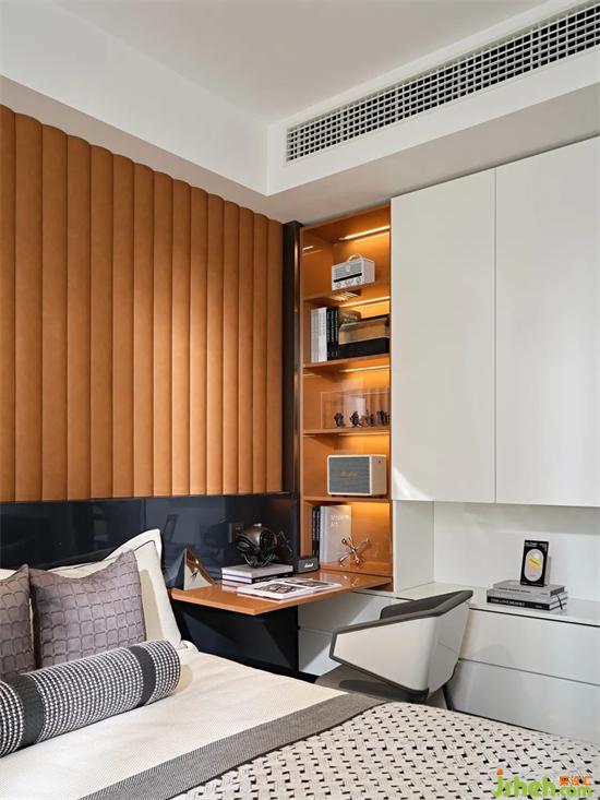 兒童房的床頭背景樣板間設(shè)計墻采用圓柱型皮革軟包,結(jié)合黑白格菱紋的床套和炫酷的潮玩裝置,尊貴樣板間設(shè)計的愛馬仕橙在這個空間內(nèi)演繹出獨屬于年輕人的節(jié)奏與韻律。