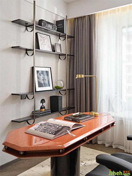 橙色書桌與復(fù)古銅的開放格架,給書房帶來復(fù)古又時尚的氣息,樣板間設(shè)計融合愛馬仕品牌元素的裝飾掛畫,黑白的線條充滿動感,打破空間的沉悶,讓其成為一處靈感的迸發(fā)地。