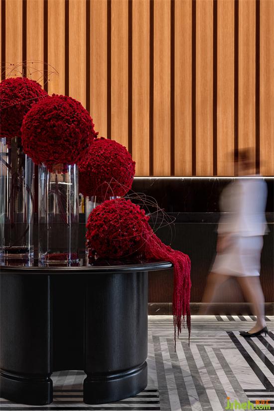 黑白線條交錯(cuò)的地磚,交替組合的圓形與方形元素,既延續(xù)并重構(gòu)了寶格麗的經(jīng)典圖案,也為大堂整體深色的空間里增添了活躍的層次感,以寶格麗低調(diào)、質(zhì)感的設(shè)計(jì)之形建構(gòu)尊貴、舒朗的內(nèi)在體驗(yàn)及售樓處設(shè)計(jì)感受。