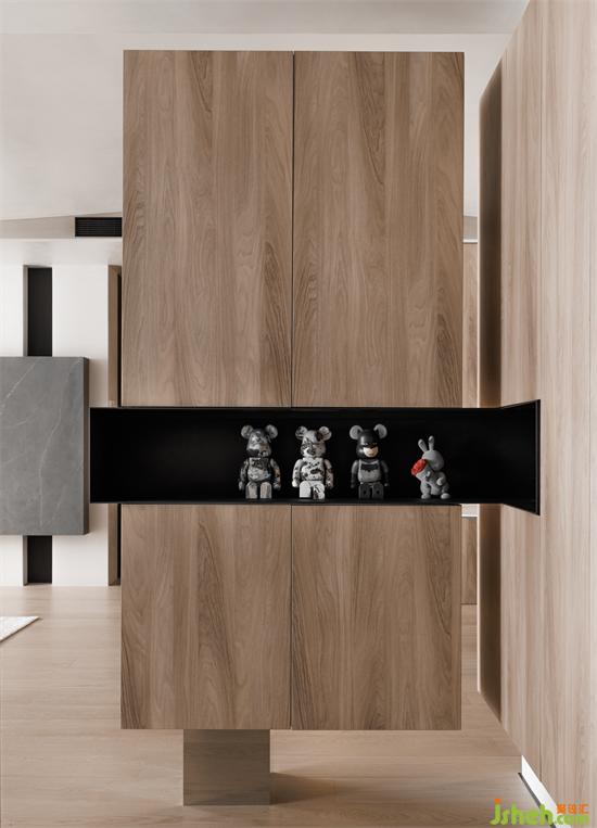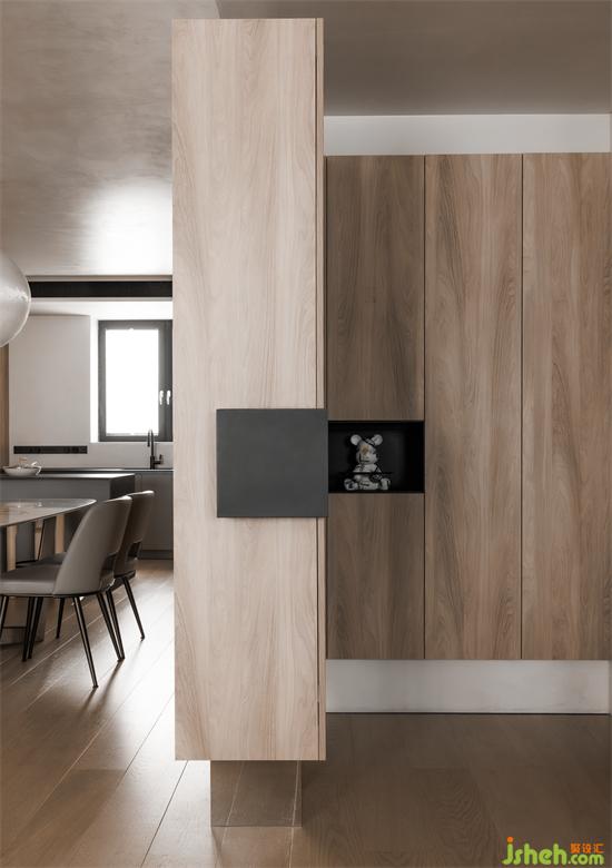客廳與書房的隔墻中間留有一條縫隙,上設(shè)鋼板連接至?xí)浚寖蓚€(gè)空間有了互動(dòng),鋼板上也能放一些業(yè)主收藏的潮玩手辦,一舉兩得。
