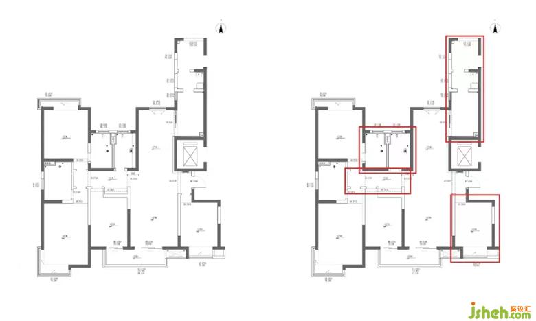 原始房型是一個(gè)四居室的戶型,由于四人居住,只需保留三間臥室,結(jié)合采光與朝向,南側(cè)次臥不保留,根據(jù)業(yè)主需求重新做規(guī)劃。家裝設(shè)計(jì)原始北面臥室套內(nèi)衛(wèi)生間與公共區(qū)域衛(wèi)生間面積都過小,不便于平時(shí)起居使用。原始過道區(qū)域也過于狹小,整體動(dòng)線不舒適。原始廚房區(qū)域比較雞肋,餐廳區(qū)域又太狹長,需重新做布局調(diào)整。