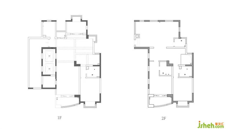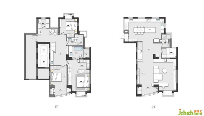一層原始是公共區(qū)域,考慮到兩個(gè)業(yè)主都是律師,會(huì)經(jīng)常加班,所以調(diào)換一、二層的功能,將臥室區(qū)域放于一層,方便回家后能直接進(jìn)入到自己的私密空間。整個(gè)二層一分為二,一側(cè)是以客廳休閑為主,另一側(cè)則圍繞餐廳廚房展開?;Q功能后,二層原始?jí)w都過(guò)于封閉,家裝設(shè)計(jì)需要打開墻體重新規(guī)劃成一個(gè)通透的空間。這樣既方便了生活動(dòng)線,又在空間上形成了交互互通,不同功能區(qū)域之間彼此獨(dú)立,又有著貫通的流動(dòng)感。