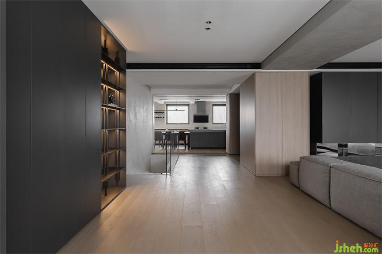 整體空間以經(jīng)典黑白灰加以原木色為主題配色 。Living Divani 的定制款沙發(fā)是整個(gè)區(qū)域的核心,搭配十二時(shí)慢的藝術(shù)感茶幾,呈現(xiàn)出鮮明有力的表現(xiàn)力,主宰了空間的第一印象。黑色、木色不同紋理的門板搭配上鏡面給人帶來(lái)的呼吸感,家裝設(shè)計(jì)不規(guī)則的設(shè)計(jì)中又有著規(guī)則的舒適度。收納功能也在隱形中得到了提升。