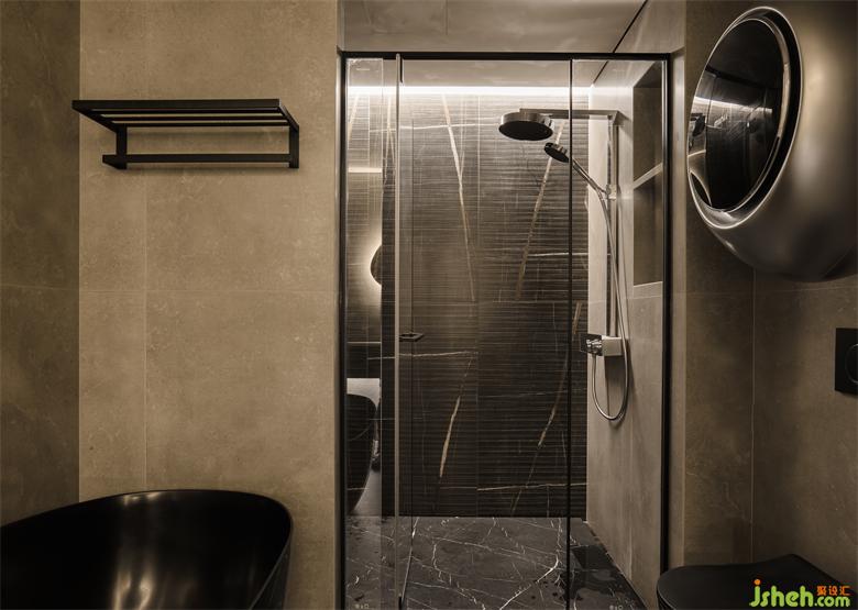 隱形門打開后,直入眼簾的黑色水磨石一體式獨(dú)立盆,美觀高級(jí)。家裝設(shè)計(jì)橢圓形鏡面背后的燈帶給衛(wèi)生間賦予了一層神秘面紗,氛圍感十足。