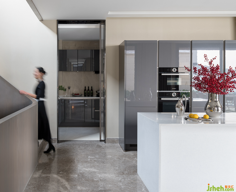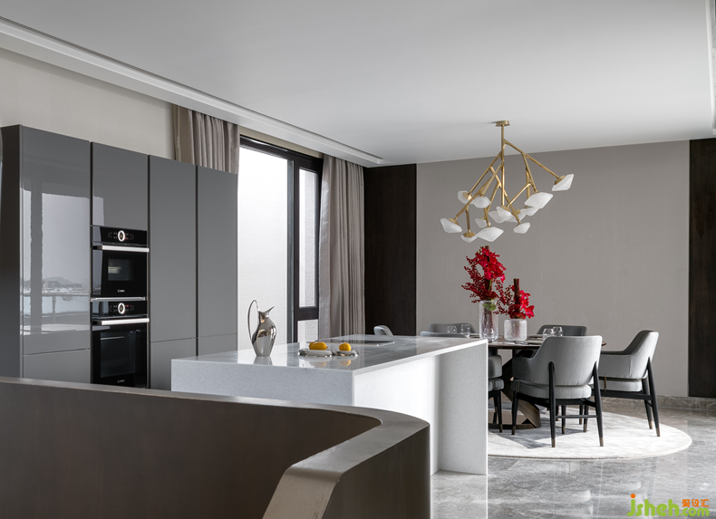 設(shè)計整體圍繞著“城市山居生活”的概念展開 ,一層核心空間功能上由中廚 ,西廚與就餐區(qū)組成,西廚中島的設(shè)計在空間中與中廚相互補(bǔ)充 ,同時為追求生活品質(zhì)感的使用者提供一個與家人互動拉近距離的平臺。