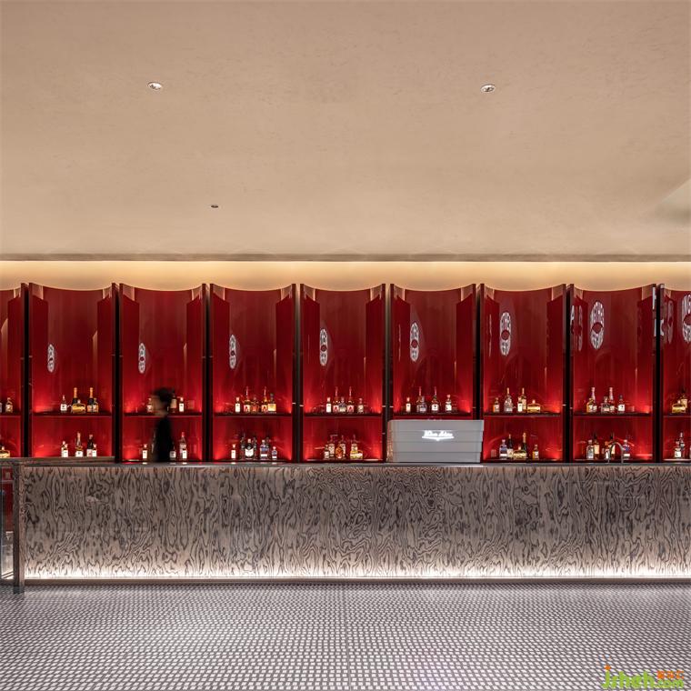 作為楊浦工業(yè)銹帶中最具特色的元素,“聯(lián)排筒倉”被以刨切的形式抽象化為空間中的城市記憶雕塑,海上和集設(shè)計并成為接待區(qū)和水吧區(qū)的超級符號。
