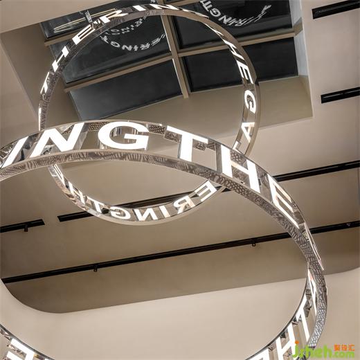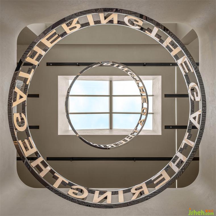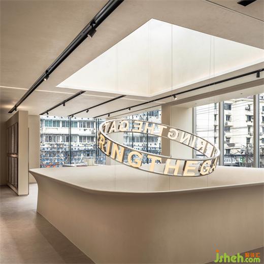 設(shè)計師在一層和二層之間創(chuàng)建了一個和樓板一體的曲面扶手作為聯(lián)通,海上和集設(shè)計像是一個工業(yè)煙囪穿插在樓板之間。巨大的燈光裝置則猶如工業(yè)作業(yè)中白煙,以螺旋形飄向天空,而風(fēng)塑造了燈的造型,輕輕搖曳,宛如天和地、歷史與未來的連接體。