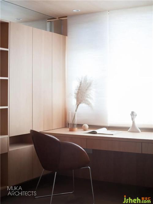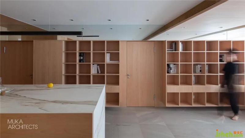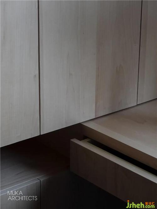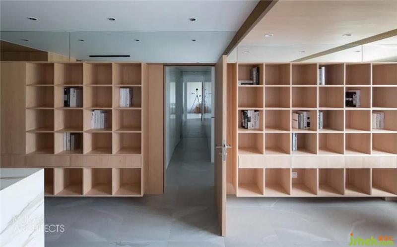 The No. 4 and No. 5 maple boxes cover two large bookshelves, which are covered by a continuous maple veneer, forming two invisible doors leading to the master bedroom and the tatami room respectively.There are 50 bookshelves suspended on both sides. Five represents the five elements of gold, wood, water, fire, earth, and the limit number of the elements that make up everything between heaven and earth. It carries the cultural heritage of the two teachers, and also contains their attitude towards teaching.
