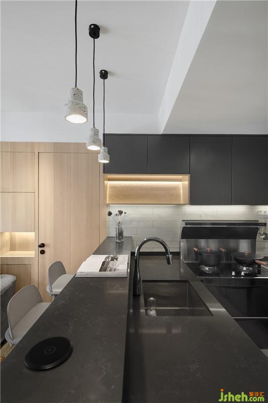 ▲餐廳吧臺和灶臺一體式設(shè)計,便于交流溝通。吧臺的電動升降插座,支持無線藍(lán)牙充電。