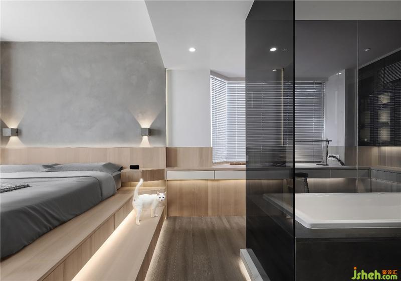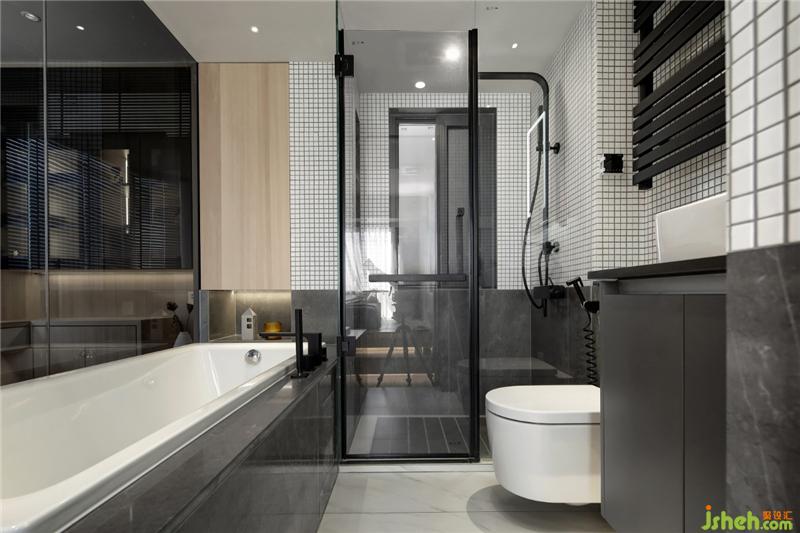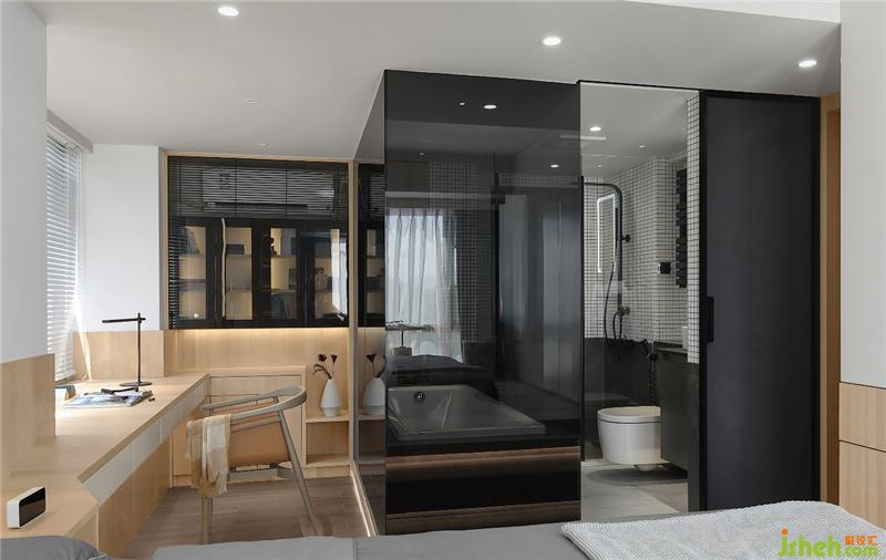 衛(wèi)生間作為一個(gè)獨(dú)立的盒子設(shè)計(jì),打破傳統(tǒng)的隔墻,改為黑色玻璃,強(qiáng)化區(qū)域界線的同時(shí),也提供了視線交流的可能性,不同空間呈現(xiàn)出不同的生活情境,且能夠視線無(wú)遮擋的交流溝通。半通透的黑色玻璃,方便清潔的同時(shí),讓衛(wèi)生間增加了一絲神秘感和情趣!
