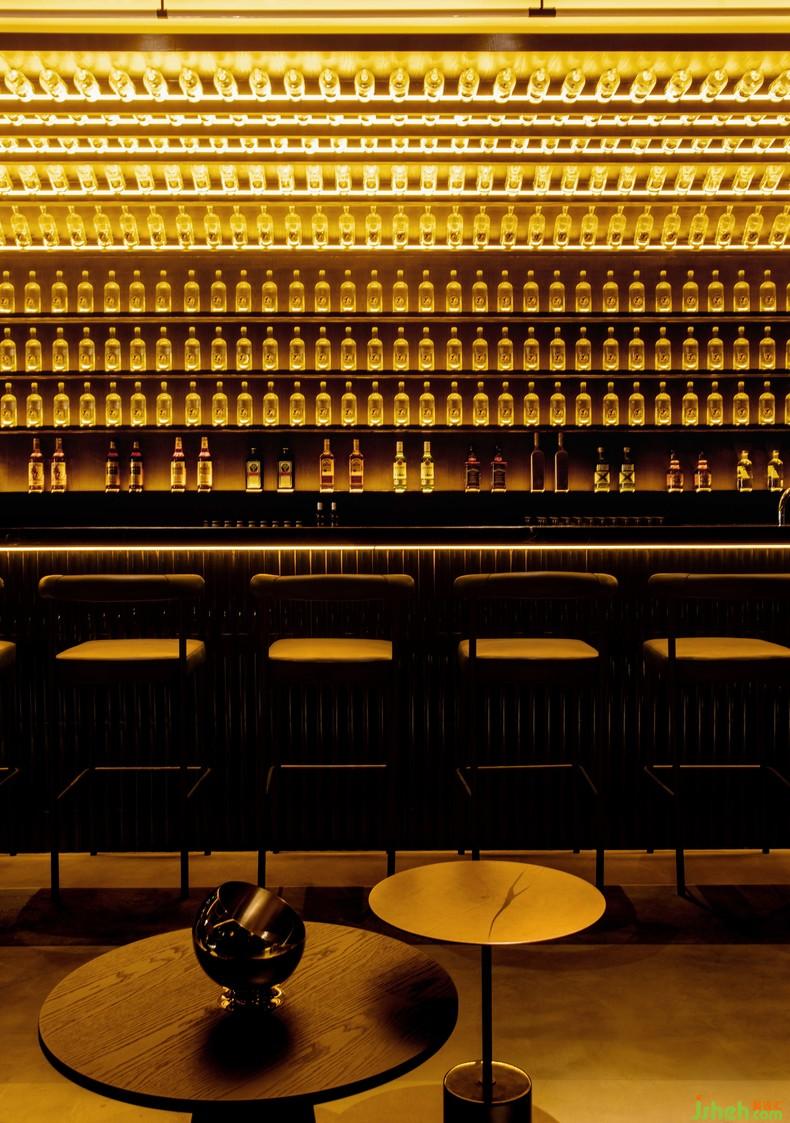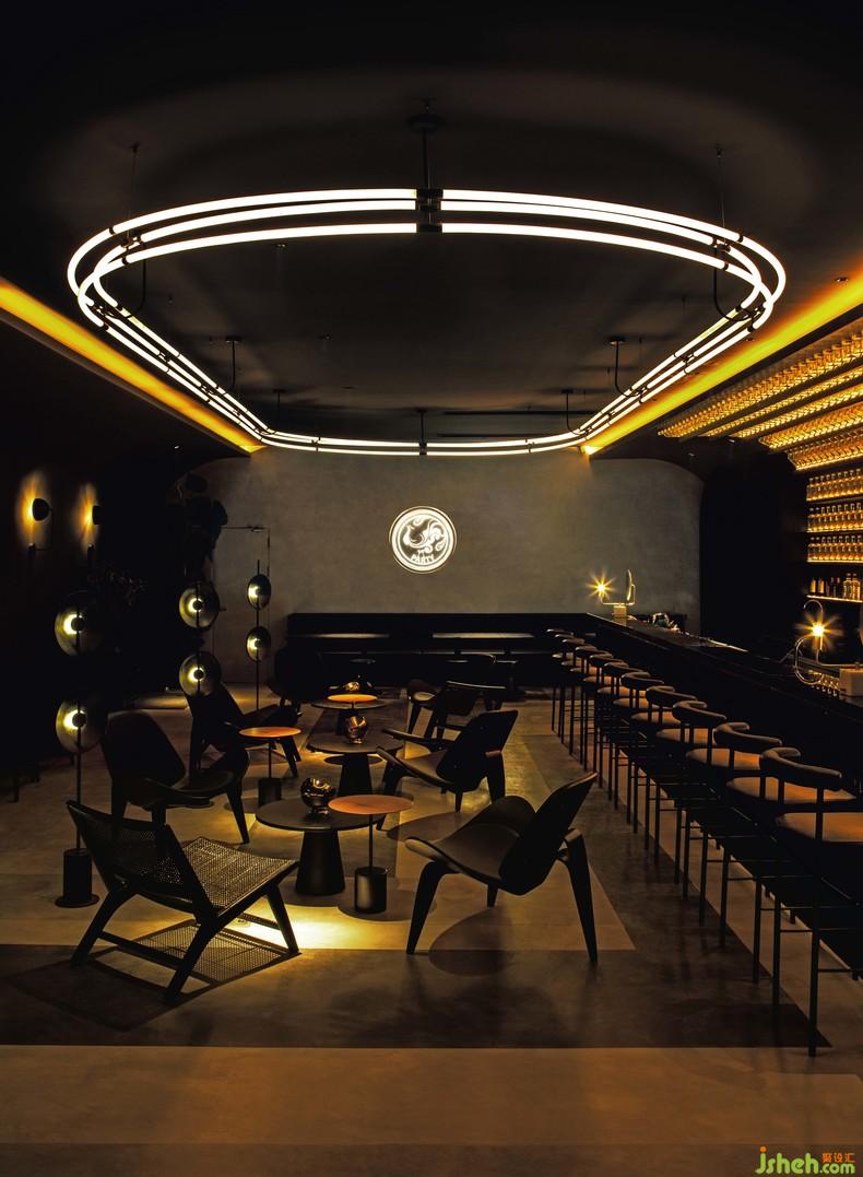 酒吧氛圍是恰到好處的放縱與克制,酒柜依靠彎曲的墻面延伸至頂,盤踞在卡座區(qū)頂部的線圈燈利落中不失復古,曖昧卻又充滿未來感。
