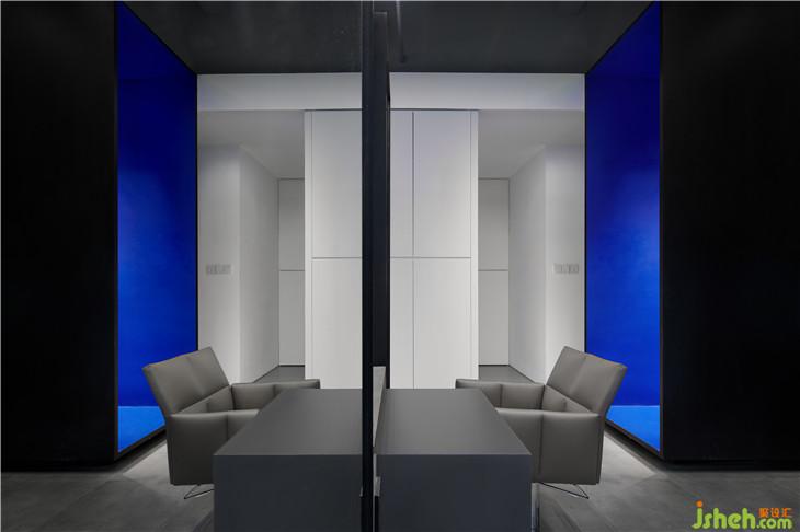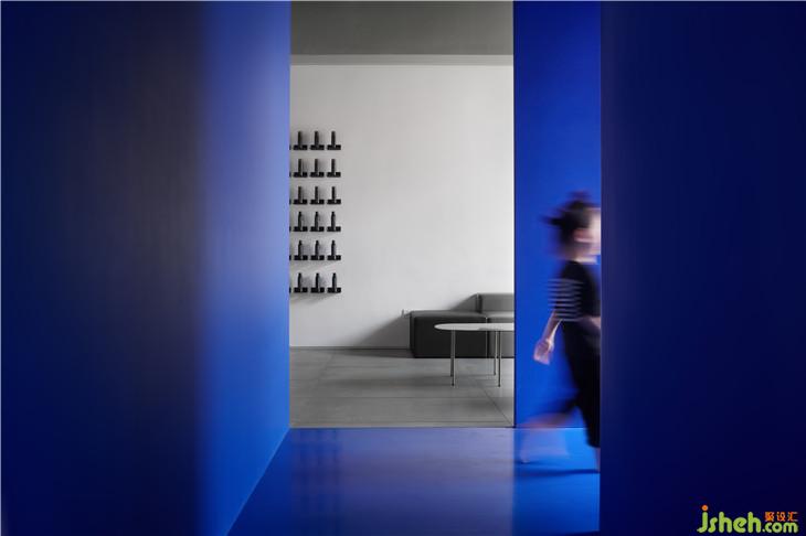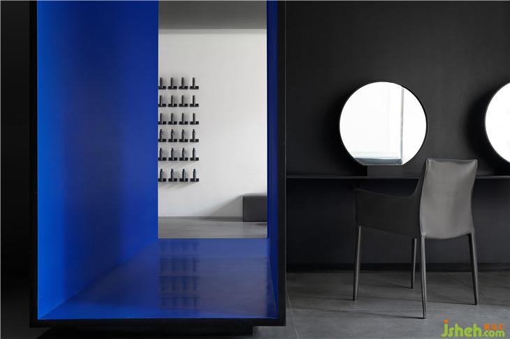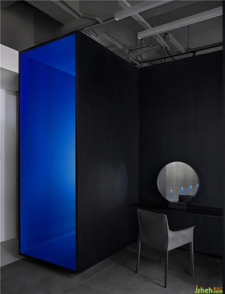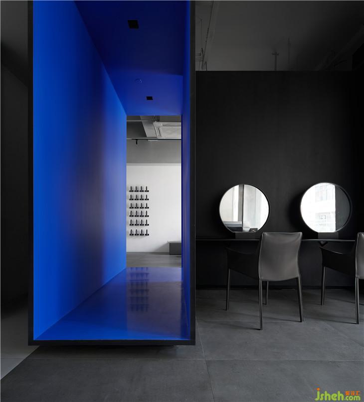 設(shè)計(jì)師在洗、剪區(qū)域之間的墻體下方預(yù)留了五個(gè)洞孔,室外的光線能夠不動(dòng)聲色地進(jìn)入洗發(fā)區(qū),后經(jīng)克萊因藍(lán)的過濾,輕薄光線在黑暗中交疊、滲透,引導(dǎo)客人行徑之余竟有一種欲說還休的美。