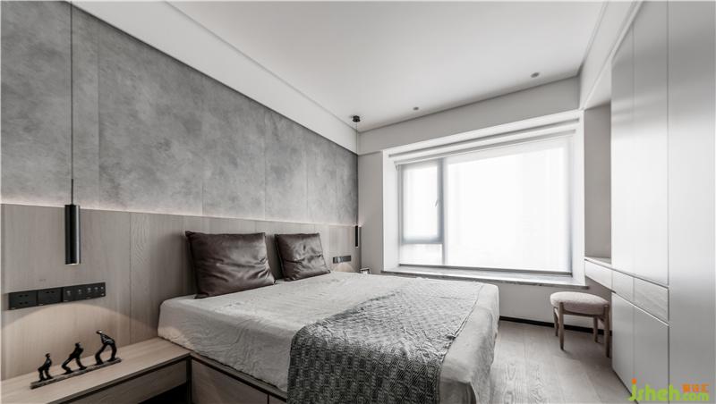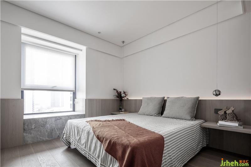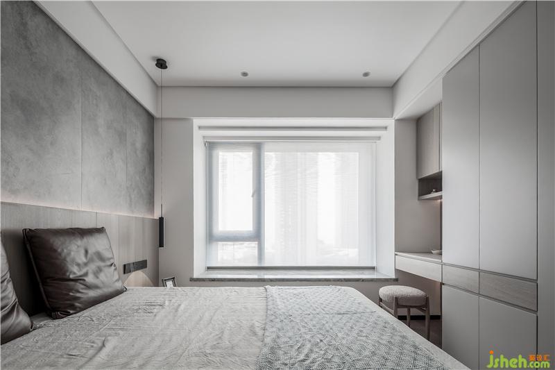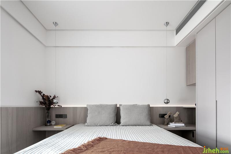 床頭處延伸到地柜室內(nèi)設(shè)計師也做了一體處理,減少了成品柜體的衛(wèi)生死角,也讓整個空間的效果呈現(xiàn)更加整潔。