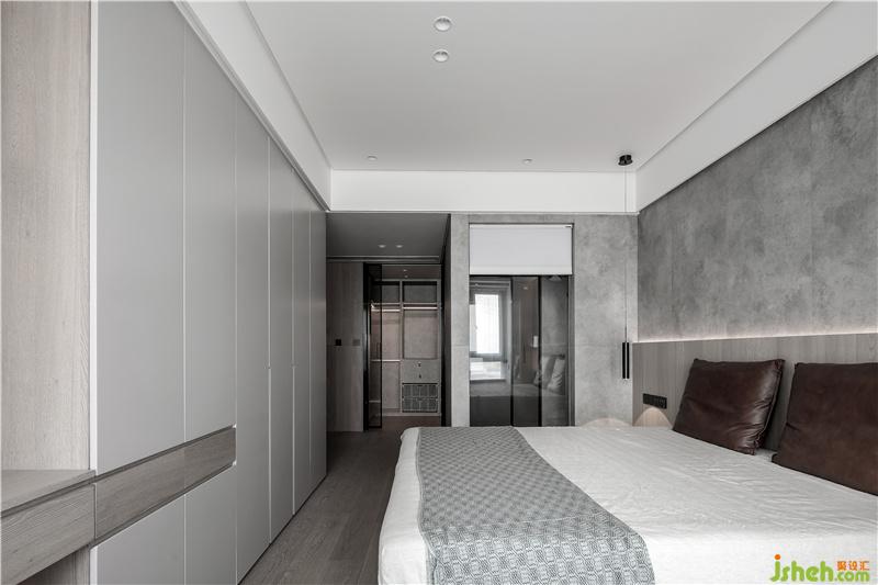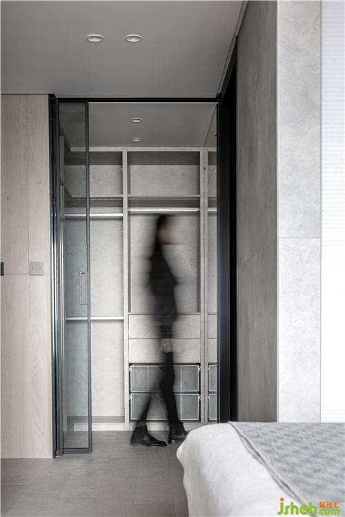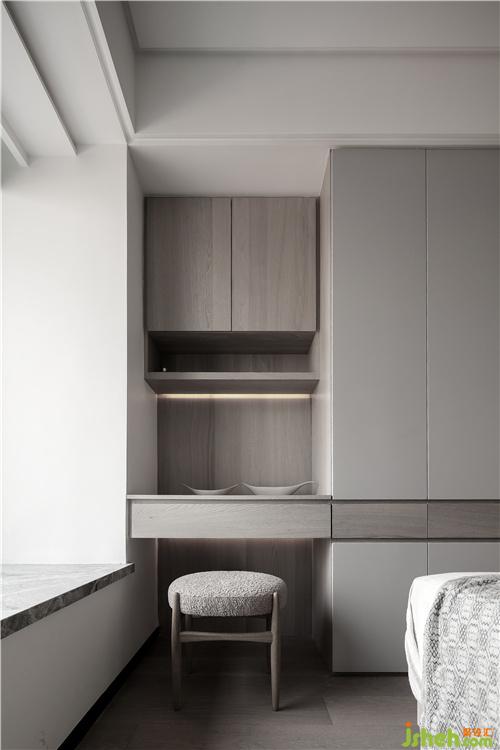 由于業(yè)主的儲物習(xí)慣,衣柜的布局上也特殊做過設(shè)計,室內(nèi)設(shè)計師將整個衣服的掛放區(qū)做了懸掛處理。而小件收納則做了地柜,中間做了抽屜,和梳妝臺延伸而在視覺上拉長空間。晚上睡覺臨時方便放取衣物,在吊柜底部增加了柔光內(nèi)嵌燈帶。