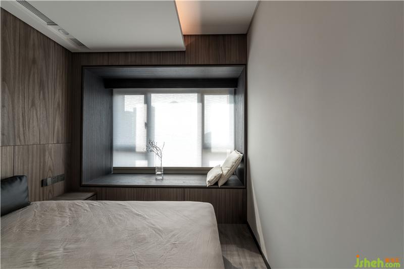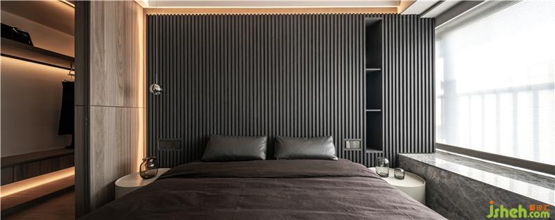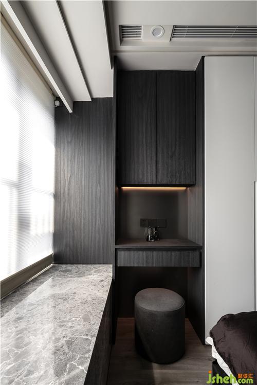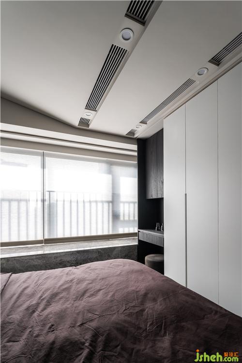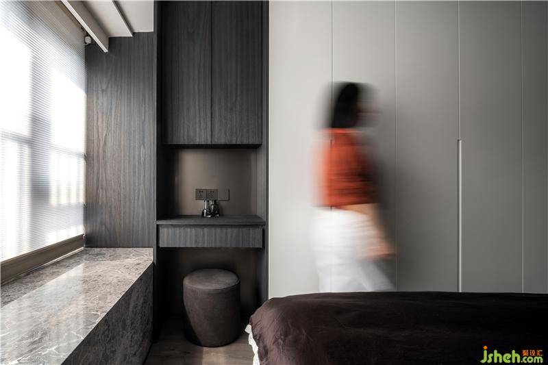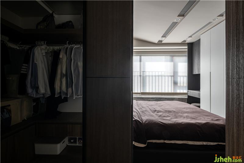 進(jìn)入主臥房,與房門相鄰的衣柜做了一個隱藏門封閉式的衣帽間,隔絕粉塵的同時也彰顯女主人生活的格調(diào)。